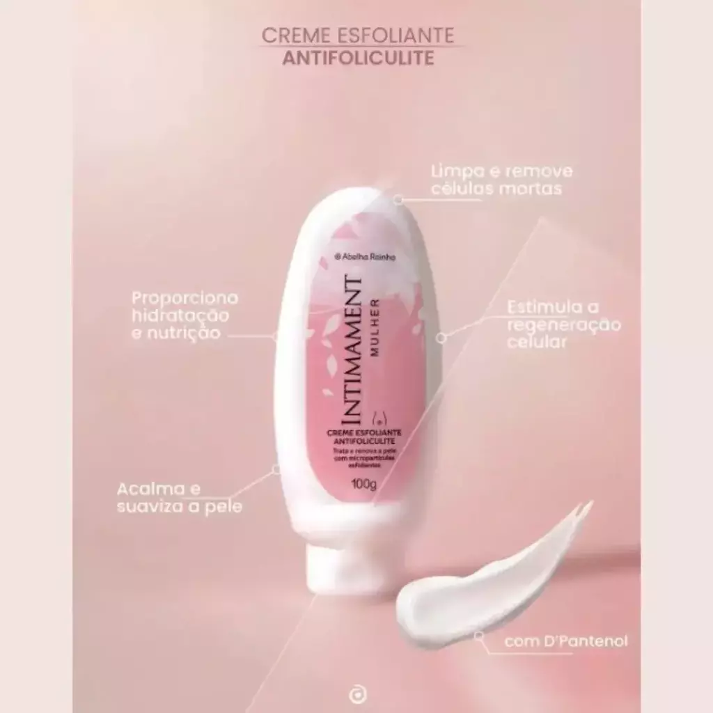Creme Esfoliante Antifoliculite Intimament Abelha Rainha é a solução ideal para quem busca uma pele mais suave e livre de irritações. Este creme foi desenvolvido especialmente para prevenir e tratar a foliculite, proporcionando uma esfoliação delicada e eficaz.
